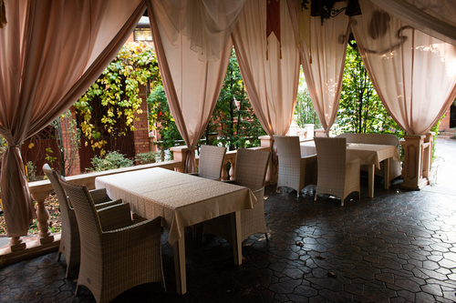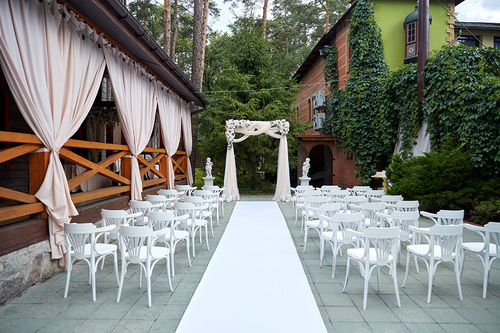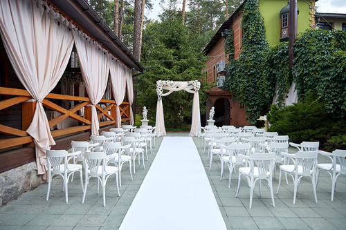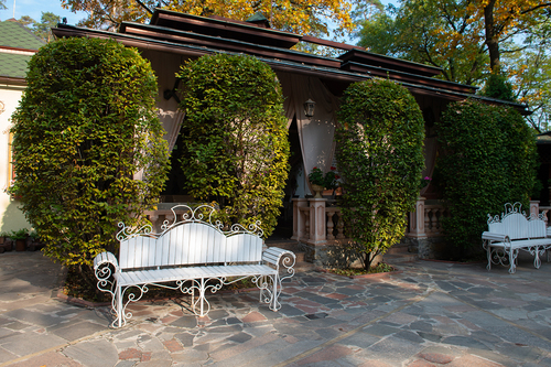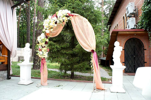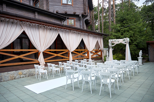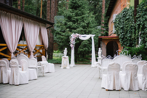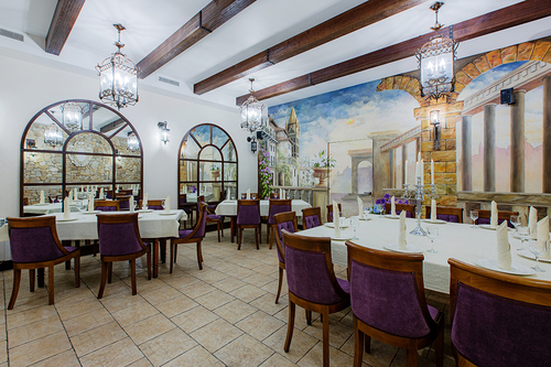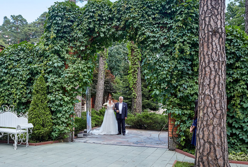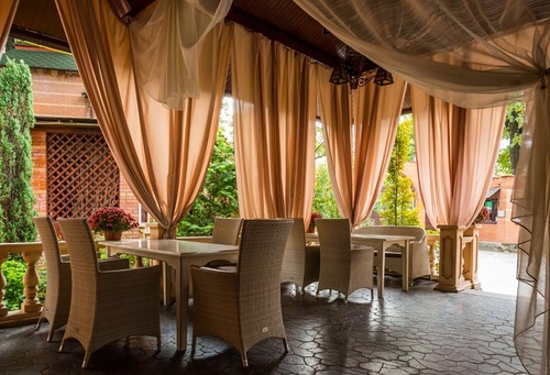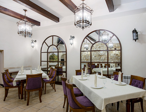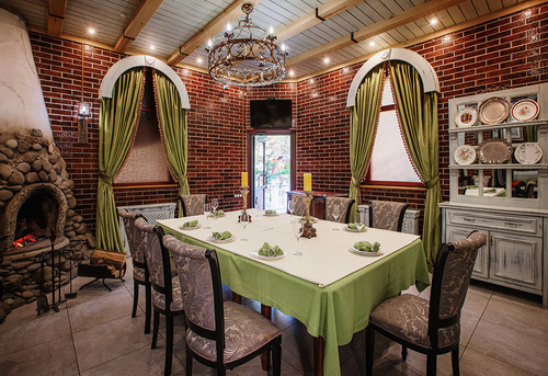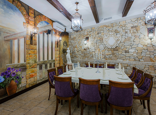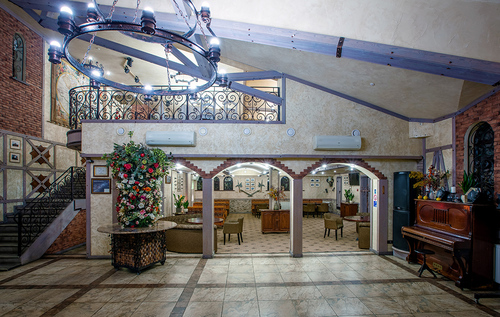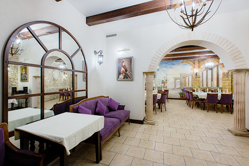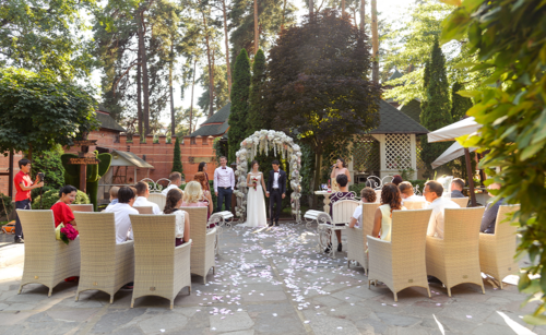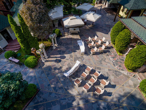 7 окремих банкетних залів, двір з фонтаном, зелені алеї та лісові арки.